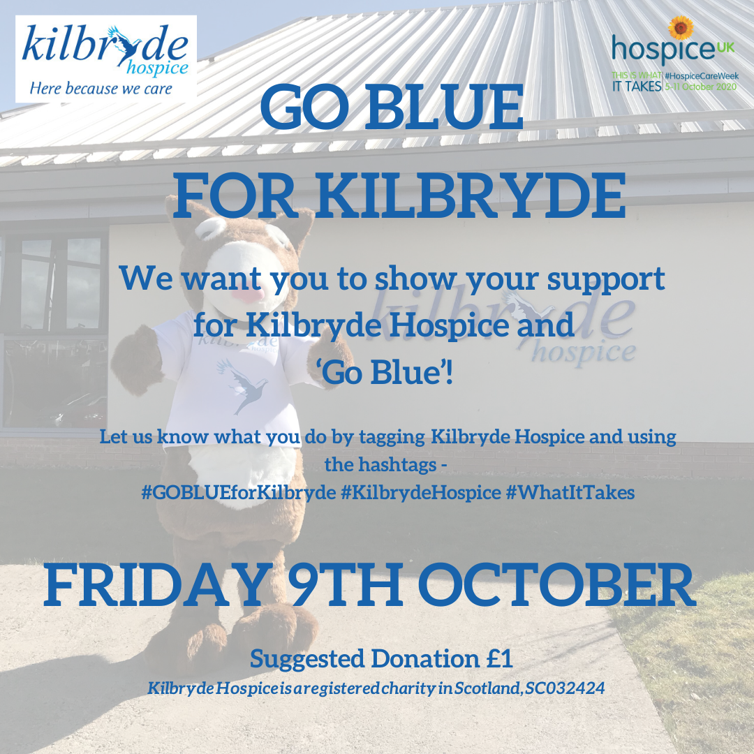 On Friday 9th October we want you to show your support for hospice care! Although our celebrations will be a little different this year we hope you will join us by GOING BLUE for Kilbryde on Friday 9th October 💙