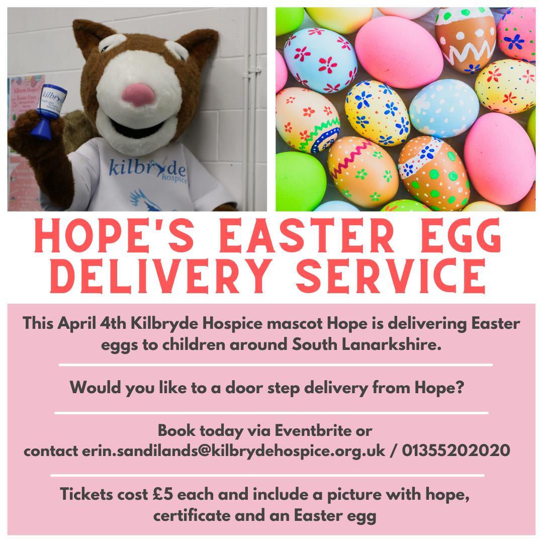 This Easter Sunday (April 4th), Kilbryde Hospice mascot Hope, is visiting children around the South Lanarkshire area to deliver some well-deserved Easter Eggs…
