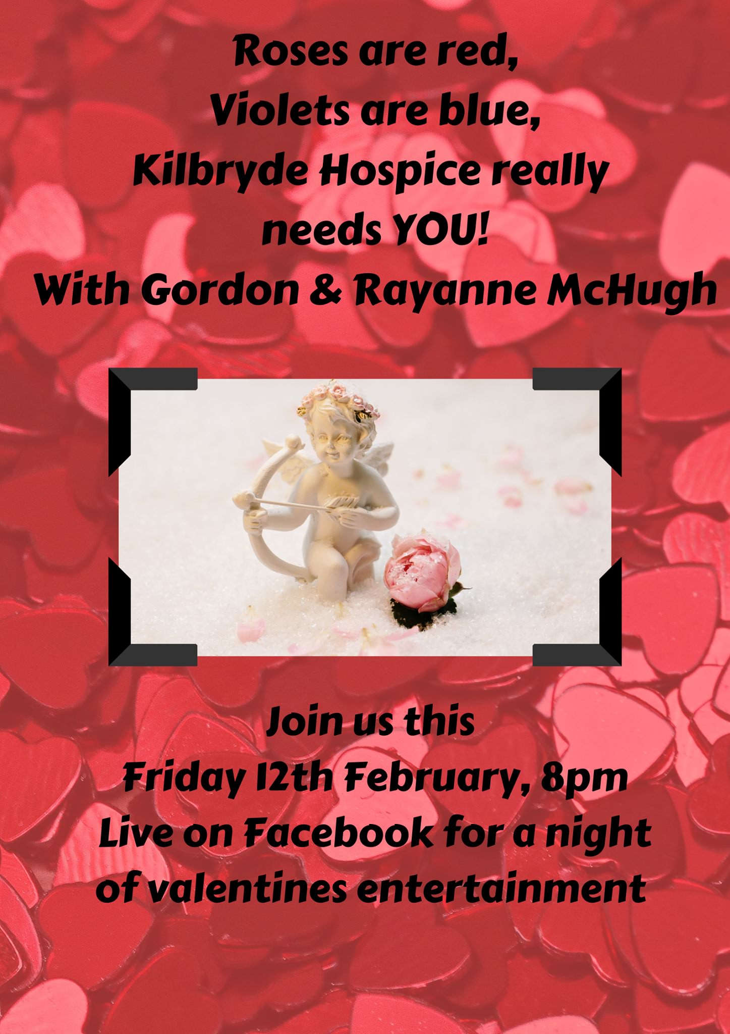 Join us this Friday 12th February at 8pm, live on our Kilbryde Hospice Facebook page for a night of valentines entertainment