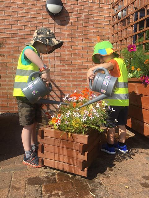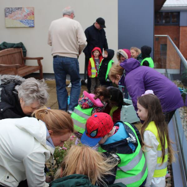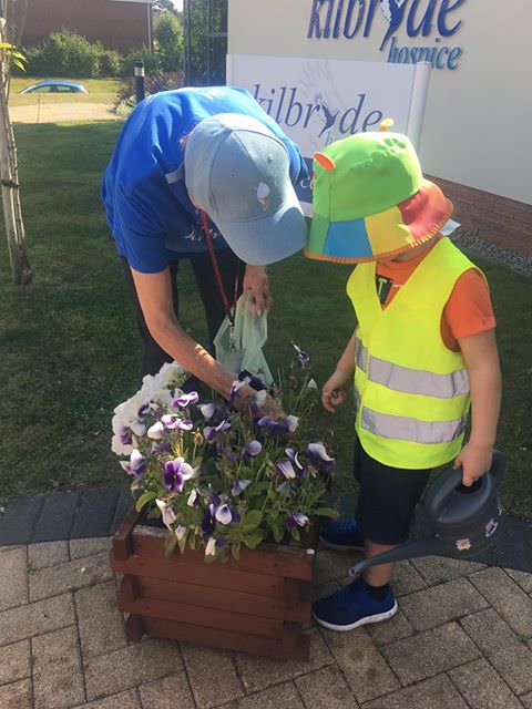 Kilbryde Hospice and Kirriemuir Nursery have recently participated in an innovative joint project. Visits from Kirriemuir Nursery children to Kilbryde Hospice Day Services has been ongoing since April 2018. Each week, 6-8 children accompanied by 2 nursery staff, visit the hospice to help water and maintain the outside garden space once a week. This interaction between the Kilbryde Day Services patients and the nursery children was wonderful to see and hear. For the children, it encouraged social interaction, increased their plant knowledge and the seeds of mutual respect were sown for the future.
