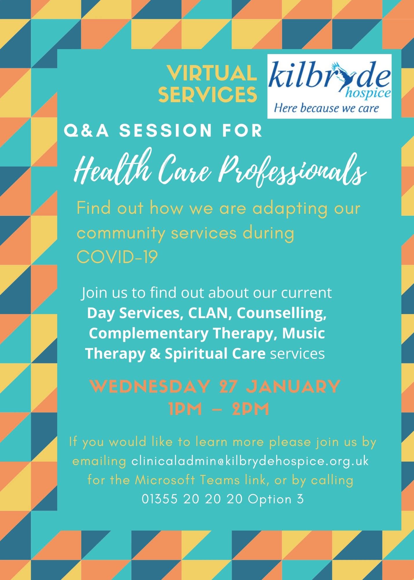 If you would like to join this session and/or would like to send a question in advance of the event please contact -clinicaladmin@kilbrydehospice.org.uk