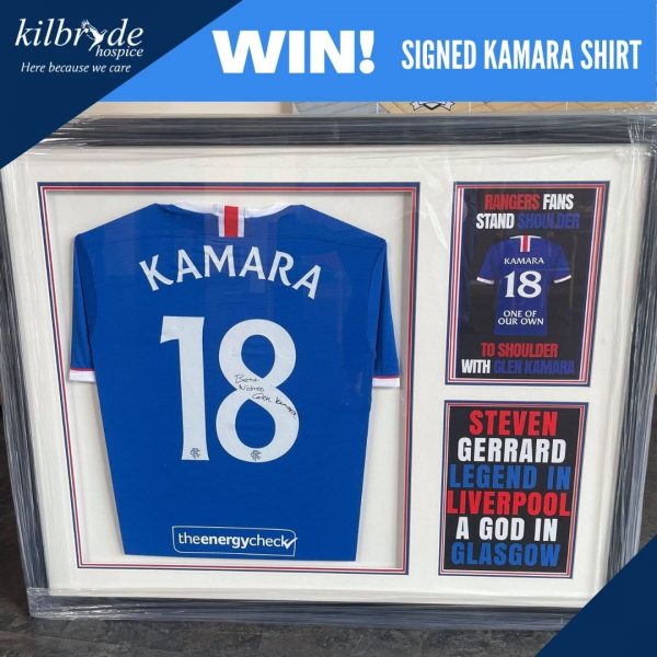 Kilbryde Hospice have kindly been donated a Signed Glen Kamara Shirt from the 2020/2021 Season. The shirt from their title winning season, is presented alongside two posters in a black frame.