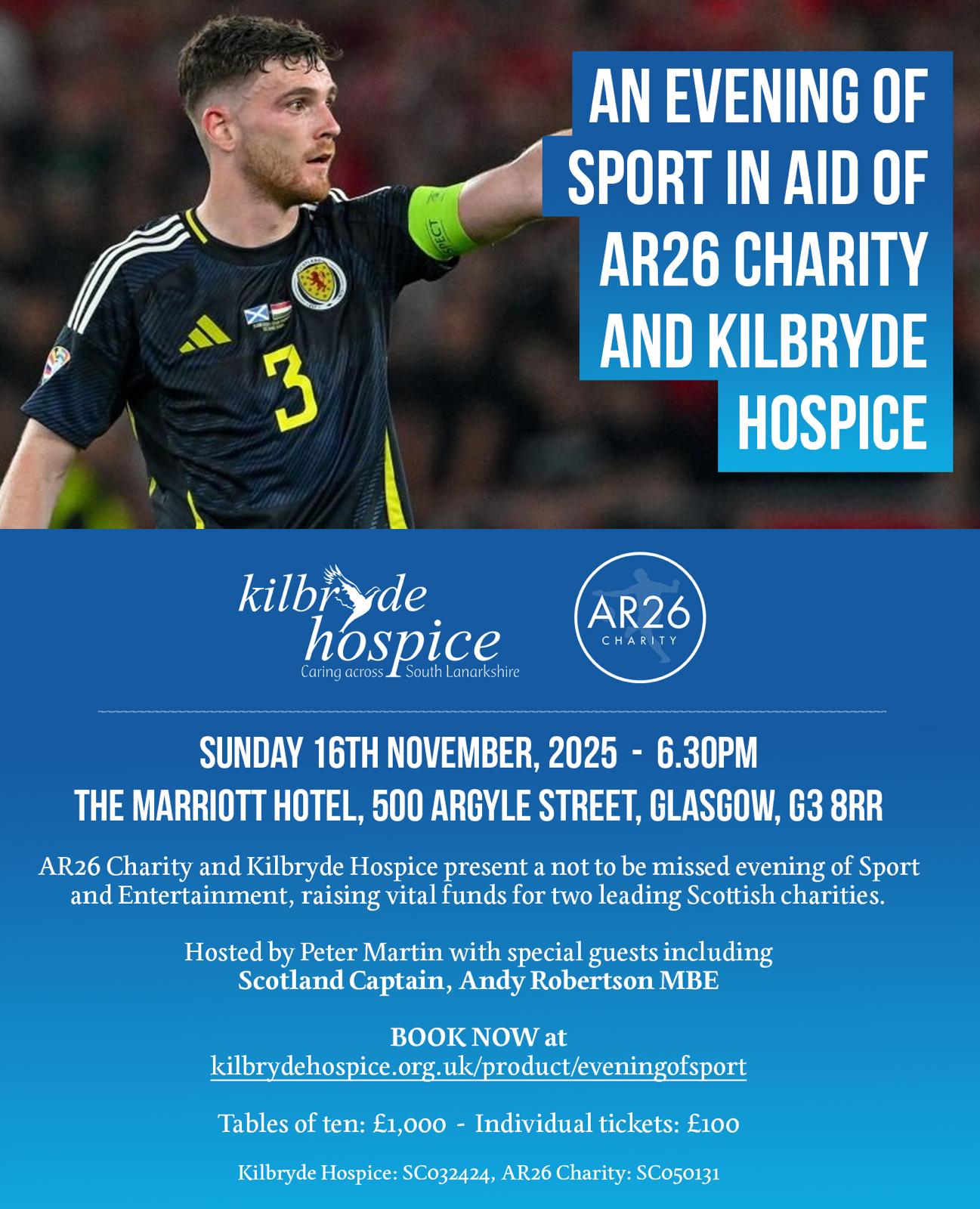 Join us for an unforgettable evening as AR26 Charity and Kilbryde Hospice come together, this exclusive event will be hosted by acclaimed broadcaster Peter Martin, with very special guest Andy Robertson MBE, Scotland captain and Liverpool FC star. Watch this space for further line up announcements!