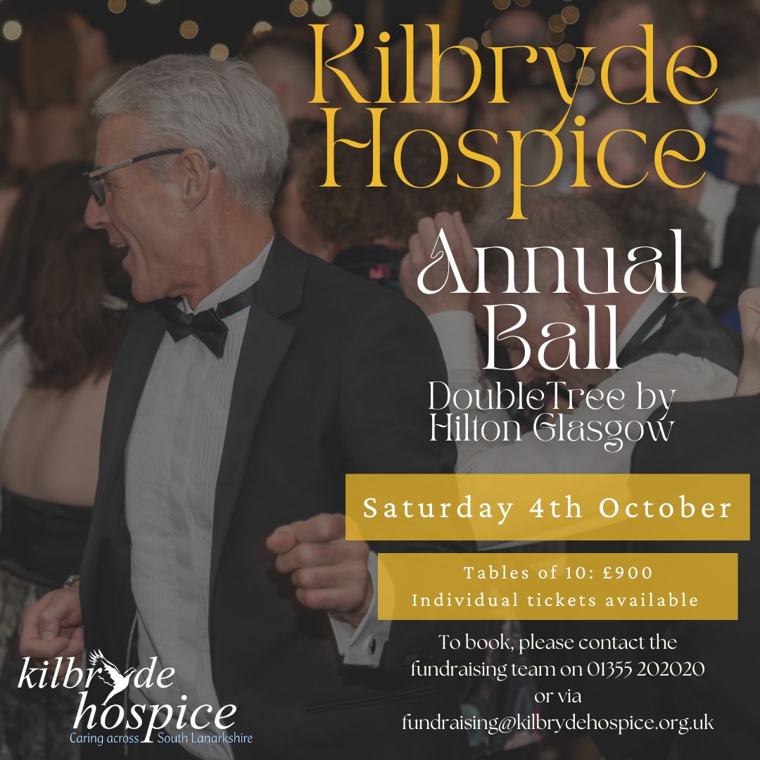 We are thrilled to announce that the Kilbryde Hospice 2025 Annual Ball will be held on Saturday, 4th October at the Doubletree by Hilton, Glasgow. This elegant evening promises to be a highlight of the year, filled with entertainment, fine dining, and heartfelt support for our local Hospice.